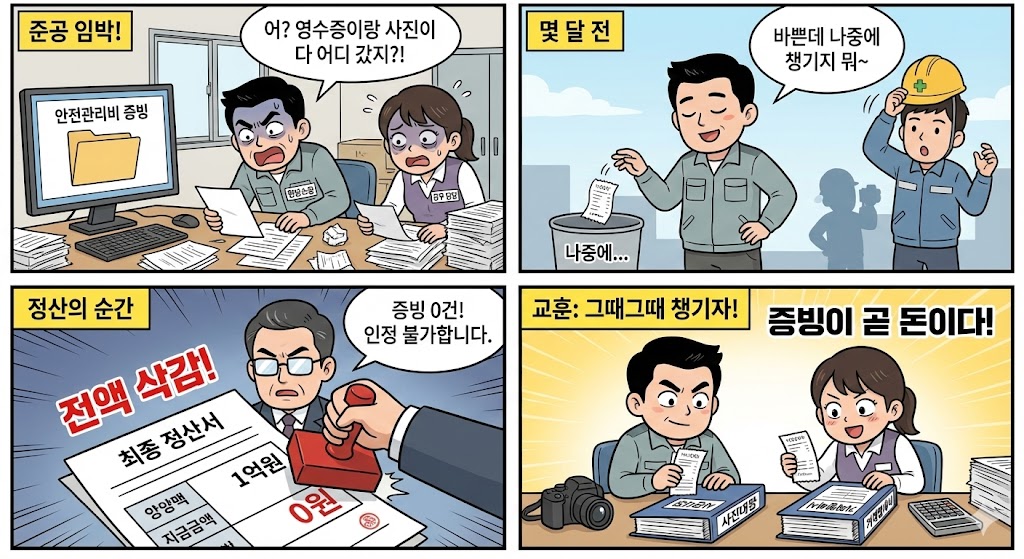 안전관리비는 '총액'으로 잡혀 있지만, 실제 안전 활동에 쓴 증빙이 없으면 준공 시 전액 삭감될 수 있습니다.